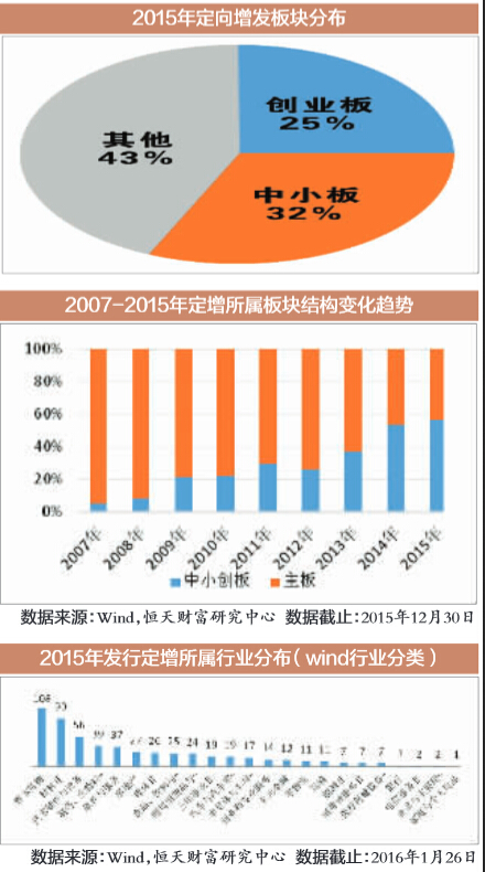 从2014年到2015年定向增发项目的行业分类来看,定增项目主要聚集在资本货物、材料和技术硬件与设备、生物医药等行业,全年定增发行家数分别达到108、90、56、39宗,相比而言,消费、食品、钢铁、银行等行业对定增似乎较为冷淡。