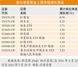 据同花顺(80.480, 7.32, 10.01%)iFinD数据,上周,分级基金H股B、恒生B的净值分别上涨了8.59%和8.25%,华夏恒生ETF、南方恒生ETF、华夏沪港通恒生ETF的净值也分别上涨了3.71%、3.56%和3.52%。同期,恒生B、H股B、汇添富恒生指数分级和华夏恒生ETF二级市场价格涨幅分别达8.78%、4.74%、3.39%和3.24%。