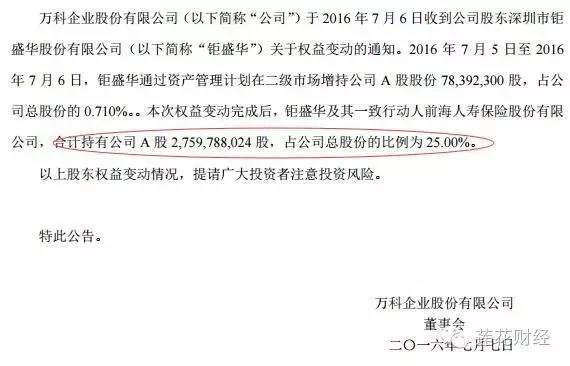 在昨天买入,宝能今天又买了点,买了309.93万股。这两天增持股数为7839.23万股,而昨天就买了7529.3万股;今天这一买,就刚刚好持股占比从昨天的24.97%达到25%了,就刚好达到要进行公告的要求。