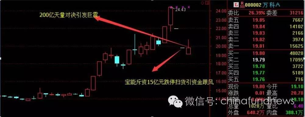 昨天宝能的点火和游资的蜂拥,果然引发的今天资金在万科A上的天量对决。在市场整体成交并不是很活跃的情况下,万科A今天成交201亿元,换手率达10.59%。作为今天第一大成交额个股,不仅远超第二名的45.8亿元,也是万科A昨天的成交额的5倍。