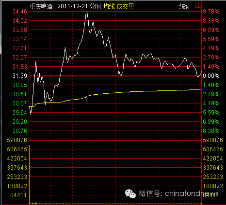 看看重庆啤酒在2011年12月20日资金尝试性撬板后第二天,12月21日重庆啤酒的资金博弈走势。与今天万科A的走势也似曾有几分相似。低开拉升回落震荡收盘,倒V形走势。都说华尔街没有新鲜事,我大A股那杠杠的也就这点事了。