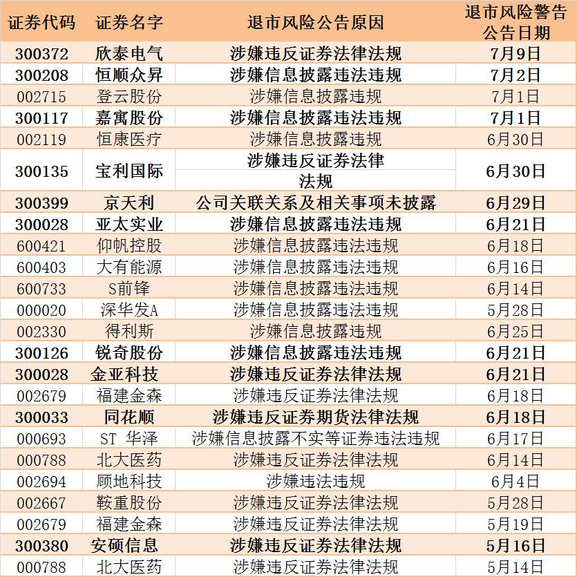 同花顺因有非法经营证券业务行为,而被证监会立案调查,6月18日时仍在发布暂停上市的风险警示;锐奇股份则是“涉嫌信息披露违法违规”而被立案调查,最后一份风险警示发布于6月21日。此外,金亚科技由于公司及实际控制人涉嫌违反法律法规而被调查中,恒顺众昇、嘉寓股份和宝利国际也仍在等待证监会的调查结果。