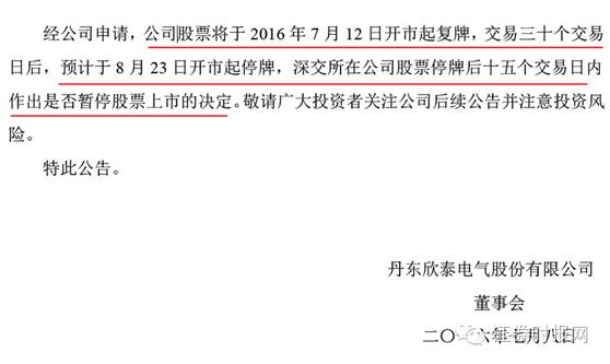 实际情况是,欣泰电气公告显示,公司将于7月12日复牌,预计交易30个交易日之后至8月23日再停牌。深交所在该次停牌后15个交易日内作出是否暂停上市决定。当然,根据欣泰电气的情况,肯定会作出暂停上市的决定。但从流程上来讲,显然现在还没有到退市整理期。