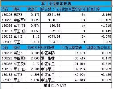 答:圈主表格里列出来的都可以看一下,但主要就是看价格杠杆、母基金整体溢价率、流动性、离下折远近几个方面,毕竟是杠杆基金,杠杆还是很重要的。比较下来,军工分级B里国防B杠杆最大,就是图涨得快也受得了跌得惨的人可以追逐它。除了杠杆之外,它的流动性指标也很好。当然指数有差异的情况下,也要看一下指数,国防指数里军工国防概念的股票更集中,今年以来涨幅优于另两只军工指数,算是锦上添花。