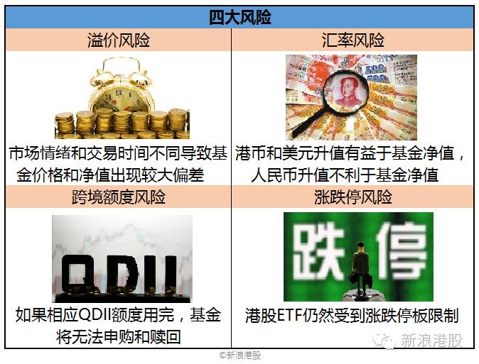 除了上文提到的溢价风险,还有不少ETF特有的风险需要注意。例如,两地的交易时间不同,当只有一边开市时,基金价格和净值也可能会有较大偏差。另外,港股ETF以人民币计价,若港币大幅贬值,基金必定减值;而港币随美元强势时,投资者也会从汇率受益。除此之外,港股ETF全部通过QDII(合资格境内机构投资者)额度交易,一旦运营港股ETF的基金公司QDII额度用完,申购和赎回就无法正常进行。涨跌停制度同样适用于在沪深上市的港股ETF,一旦港股大幅上落,港股ETF将会触及涨跌停板而停止交易。