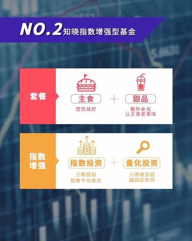 如果从吃货的角度来理解指数增强型基金的话,那么你就把指数增强当作是一份套餐吧,这份套餐由主食甜品组成。这份套餐,由两种不同的投资方法组合而成,不同预期目标的操作模块打包来满足食客的要求。具体而言,套餐中的主食部分主要就是用来先填饱肚子的,满足基本生存需要;套餐中的甜品部分就不一样了,对于已经填饱肚子的人来说就相当于让这餐饭更有品质,是一种额外的锦上添花。