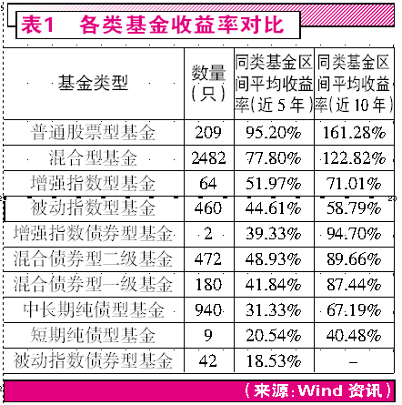 不过,投资市场上一向有“南橘北枳”之说,即便是国外“股神”的成功经验,在A股市场也未必能适用。巴菲特连续九年力捧指数基金之后,有财经大V贴出国内基金的统计数据(表1),从数据中可以看出,最近10年被动指数型基金的平均收益率为58.79%,增强指数型基金的收益率略高,但也只有71.01%。而同期普通股票型基金的收益率为161.28%,混合型基金的平均收益率为122.82%。显然,巴老如果在中国大陆下这个赌局,基本上会输得找不着北。