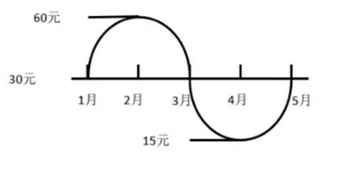 假如上面是一个简单股价走势图,1、2、3、4、5月价格分别是30元、60元、30元、15元,30元。