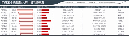 截至6月14日,两市63只ST股(共73只,排除10只一直停牌的)中,58只年内股价处于下跌状态,占比达92%;跌幅超过三成的也有39只,占比超过60%。