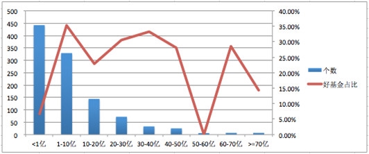 B、以基金表现看,规模小于1亿的基金,表现能进前30%的比例很低。而1-10亿,以及20—40亿基金规模的基金,表现能进前30%的比例超过了3成。规模大于40亿的基金,有个别基金表现非常好,把大盘子基金管理好,这种基金的基金经理是非常优秀的。