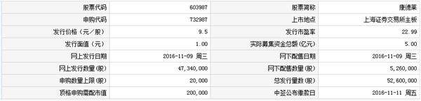 根据上交所公告,上海康德莱企业发展集团股份有限公司于11月21日在上交所主板上市交易。公司首次公开发行不超过5260万股,公司本次发行价格为9.5元/股,市盈率为22.99倍。公司股票简称为“康德莱”,股票代码为“603987”。
