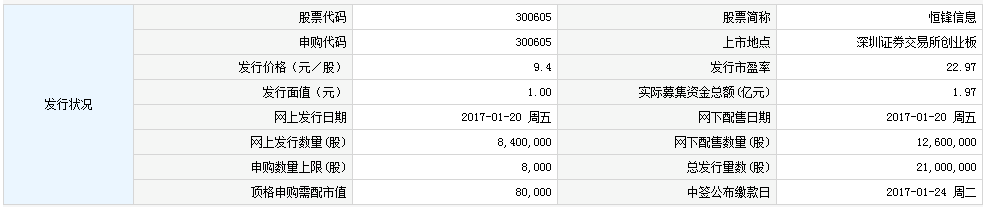 恒锋信息科技股份有限公司于2017年2月8日起在深交所创业板上市交易。公司本次发行规模不超过2,100万股,本次发行价格为9.40元/股,发行市盈率为22.97倍。股票简称为“恒锋信息”,股票代码为“300605 ”。