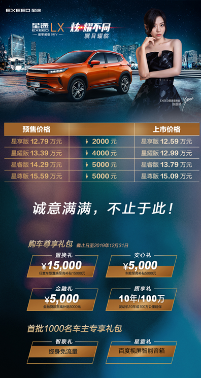 10月8日,EXEED星途品牌旗下第二款车型EXEED星途LX携手EXEED星途星推官张靓颖,正式上市并公布价格。此次上市共有四款车型,分别为星享版、星耀版、星睿版以及星尊版,售价区间为12.59万——15.09万元,相比预售公布的12.79万-15.59万的价格,此次EXEED星途LX的上市售价进一步提升了EXEED星途LX的选择价值,其中入门版在预售价的基础上减少了2000元,这意味着仅需12.59万即可拥有中国新高端智能汽车,而最高配15.09万的价格更是凸显EXEED星途LX对于用户的诚意。