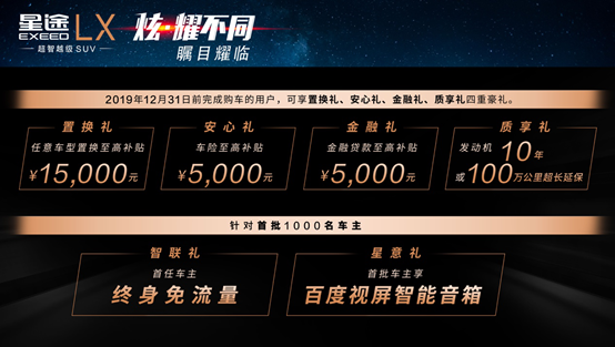 此外EXEED星途LX还针对首批1000名车主设置了智联礼和星意礼专享礼包,展现了对用户信任的回馈。