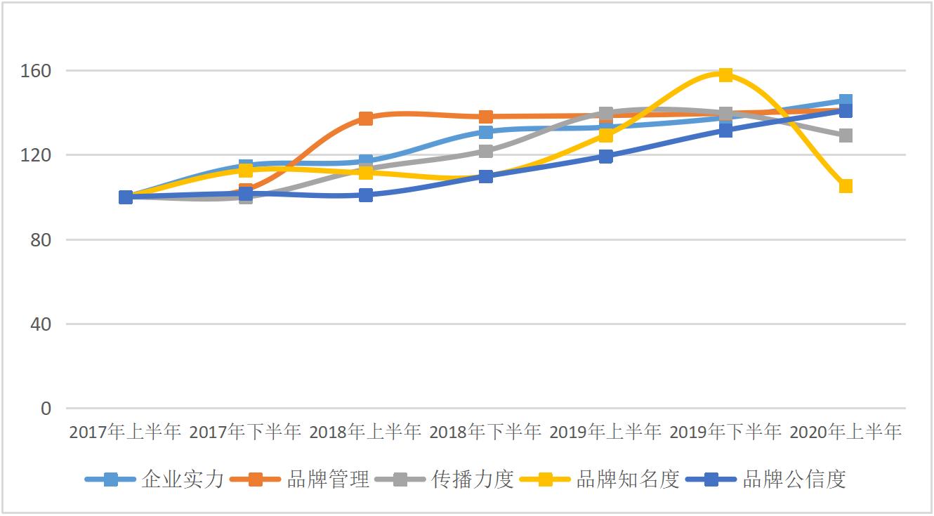 从分项指数来看,茅台的企业实力、品牌管理仍然稳步提升,指数值均超过140点。茅台集团在严格疫情防控的前提下,按照“计划不变,任务不减,指标不调,收入不降”的“四不”要求,有序复工复产,上半年实现营收439.53亿元、净利润226.02亿元,同比分别增长11.31%和13.29%,在复杂严峻的市场环境当中,保持了双位数的高质量增长,取得了自2001年上市以来最好半年业绩。