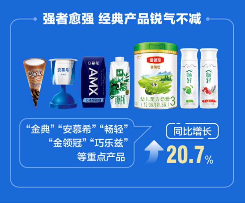 报告期内,伊利旗下重点产品继续保持着强劲增长态势。数据显示,“金典”“安慕希”“畅轻”“金领冠”“巧乐兹”等重点产品销售收入比上年同期增长20.7%,锐气不减。金典有机奶、安慕希、畅轻市占率分别位居细分领域第一,尤其是2020年下半年上市的安慕希AMX小黑钻系列、安慕希5G蛋白系列销售快速增长,显现出品牌潜力;而以“金典”A2β-酪蛋白有机纯牛奶、“伊利”臻浓高钙牛奶、“畅轻”蔗糖减半果茶酸奶、“QQ星”儿童成长配方羊奶粉、“巧乐兹”巧榛橘冰淇淋、“优酸乳”乳汽气泡乳等为代表的的公司新品销售收入占总营收比例达到15.6%,也已经成为伊利股份业绩增长的重要力量。