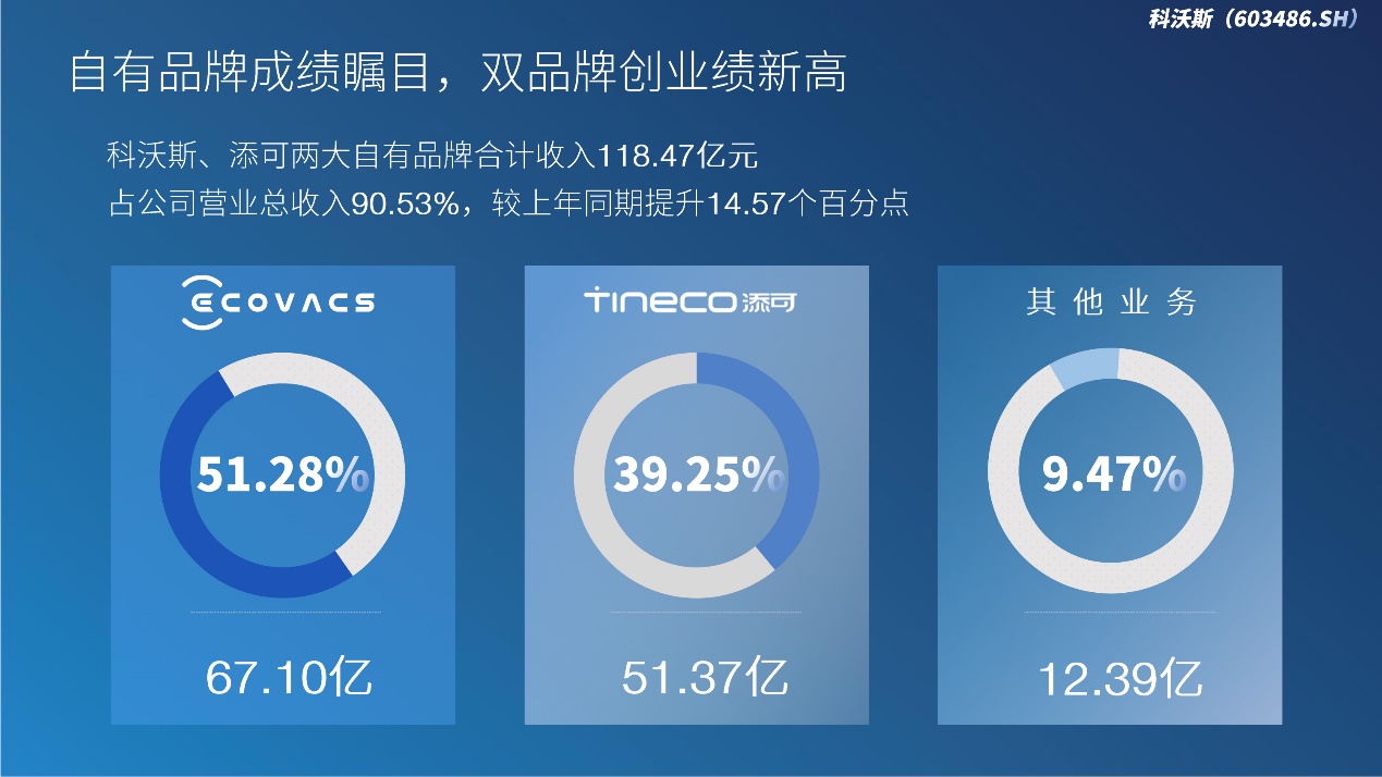 盈利能力显著增强的背后,离不开其自主品牌业务“量价齐升”的靓丽表现,2021年科沃斯两大自主品牌合计业务收入占比达90.53%,同比提升14.57个百分点,两大业务也继续在各自领域中巩固行业龙头地位。