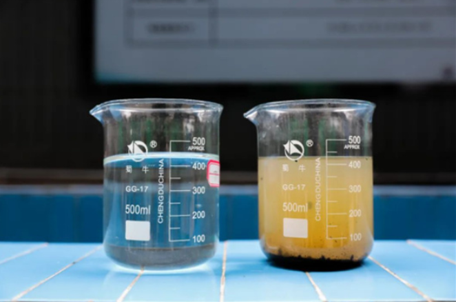 经污水处理厂处理后的水(左)与未经处理的水(右)比较