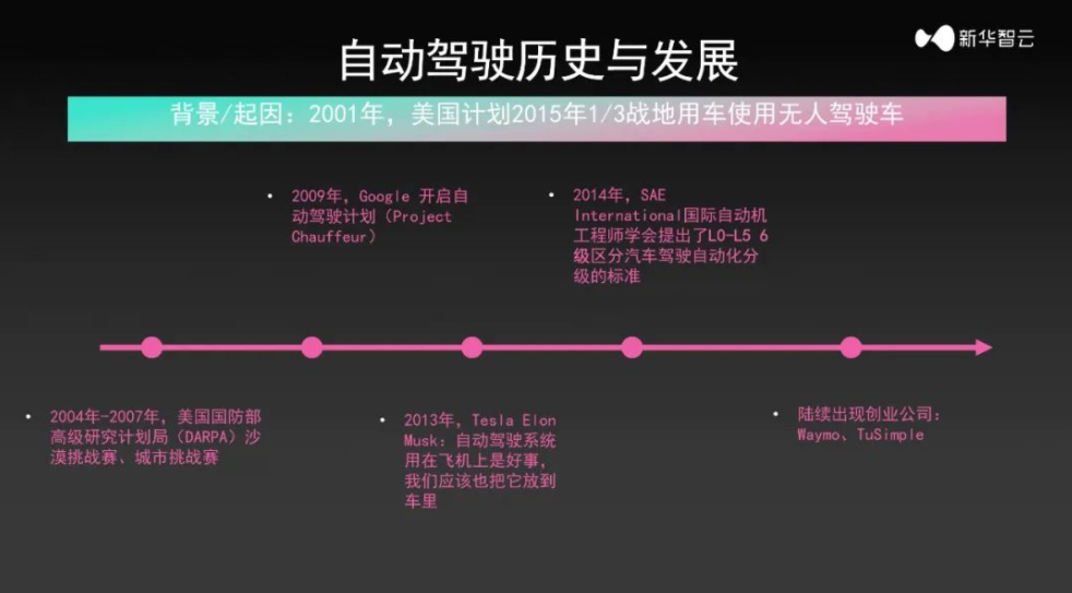 鉴于此,我们先来了解下自动驾驶的发展历程。自动驾驶最早提出是为了解决军事问题。2001年,美国计划2015年1/3战地用车可以使用无人驾驶车。在这个军事大目标的指导下,2004年至2007年,美国国防部就启动了系列关于无人驾驶汽车的比赛,比如沙漠挑战赛、城市挑战赛等等。2009年,谷歌正式成立自动驾驶实验室,并提出自动驾驶计划Project Chauffeur,这个实验室是自动驾驶创业公司Waymo的前身。