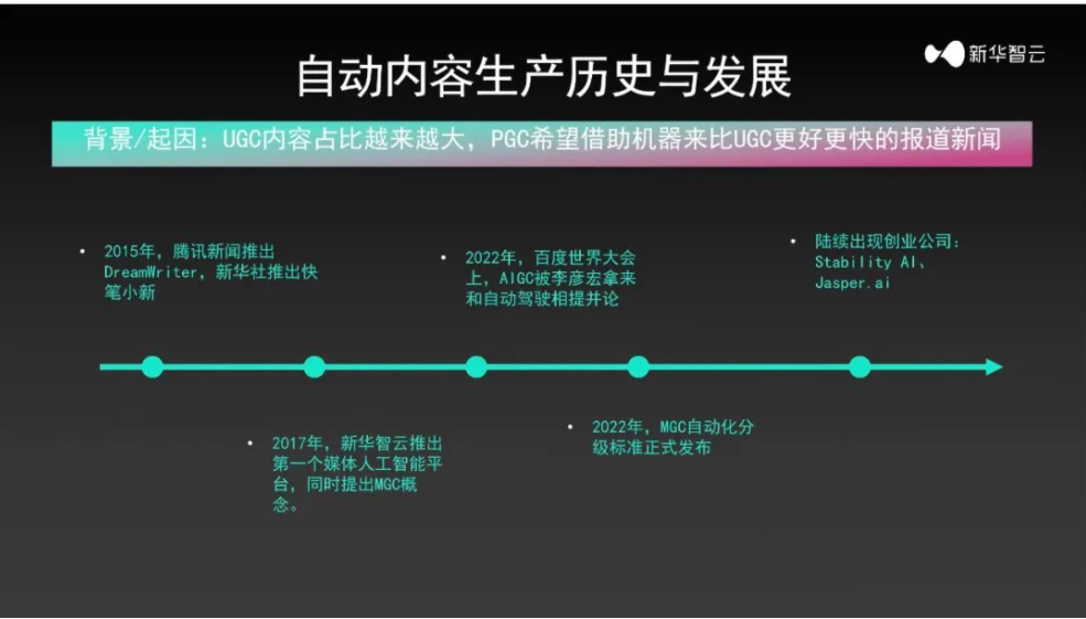 2015年,腾讯新闻推出DreamWriter,新华社推出快笔小新,以此用来辅助PGC新闻生产。当然在这之前,我们其实看到很多文字自动化生产的工具在辅助内容生产,但大部分产品都没有形成产品化和体系化,最后就不了了之了。2017年,新华智云在成都推出了全国第一个媒体人工智能平台,首次提出MGC这个概念,并在现场生产了首条MGC新闻视频。这是一个标志性事件,因为一方面我们看到一个专业的团队前瞻性地预测到了未来内容生产的发展趋势,并专注于机器生产内容这件事;另一方面我们又从文字的自动化生产跨越到了视频的自动化生产,这在当时是非常大的突破,行业内还没有人能做到。