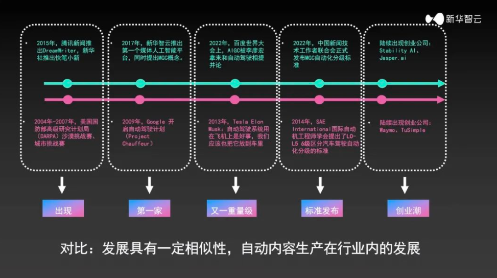 两年来,新华智云在制定MGC标准的过程中,通过对自动驾驶的细致研究,对自动内容生产领域多年来的实践经验的总结,发现两者无论是从背景、行业发展,还是底层逻辑上,都具有极强的相似性和共性。以此类推,我们相信任何一个行业的自动化发展过程,都有规律可循:如今自动驾驶可以为自动内容生产提供参考,未来自动驾驶和自动内容生产也同样将对其他各行各业起到示范作用。