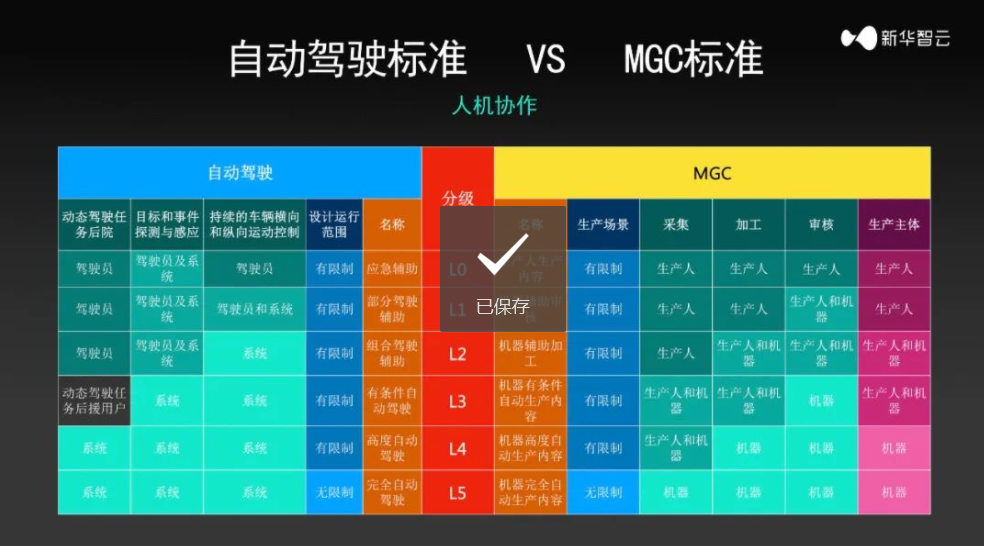 近日,由新华智云牵头制定的机器生产内容(MGC)自动化分级团体标准正式发布。看过标准的人可能会问:同样是L0-L5六级,同样对要素和场景做了区分,同样考虑人机协调程度……机器生产内容与自动驾驶有什么关系?是否只是简单地“复制”?