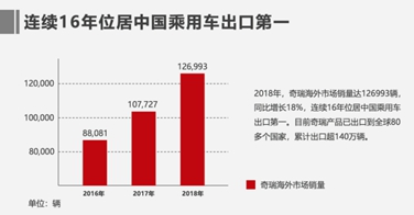 正是这样肩负使命感的一步一个脚印,让奇瑞在包括“一带一路”在内的海外市场打下了坚实的市场基础,树立了良好的品牌形象。2015年、2016年和2018年,奇瑞三次入选 “最佳海外形象企业”评选20强,位列汽车行业第一位。