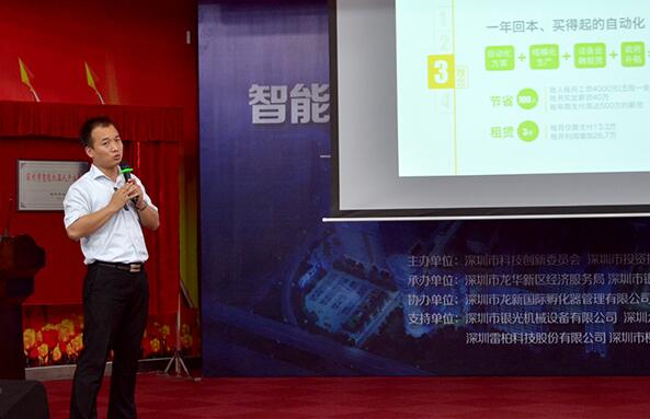 4月25日,由深圳市投资推广署、深圳市龙华经济服务局主办的《智能机器人与手机智能制造高峰论坛》,在深圳龙华新区科技企业孵化器大楼举行。拓斯达科技华南区域总监张朋先生受邀作“一年回本的自动化解决方案-机器换人”主题演讲。