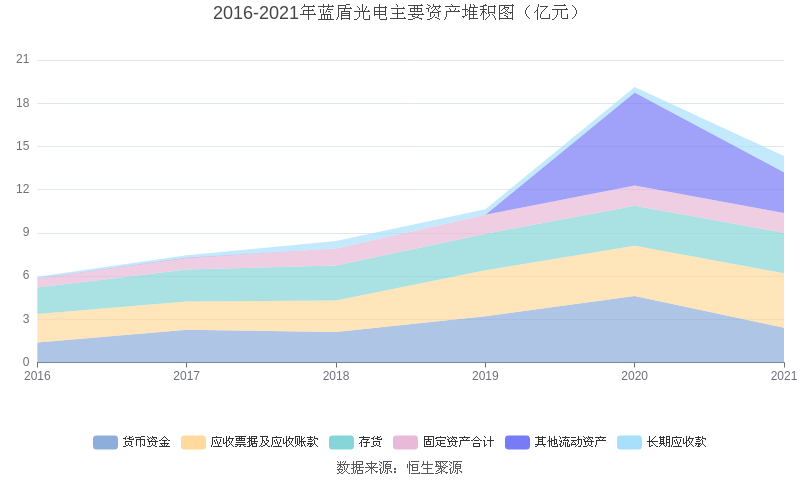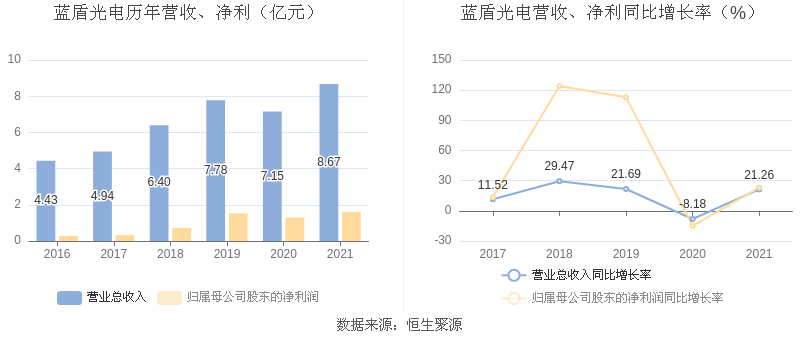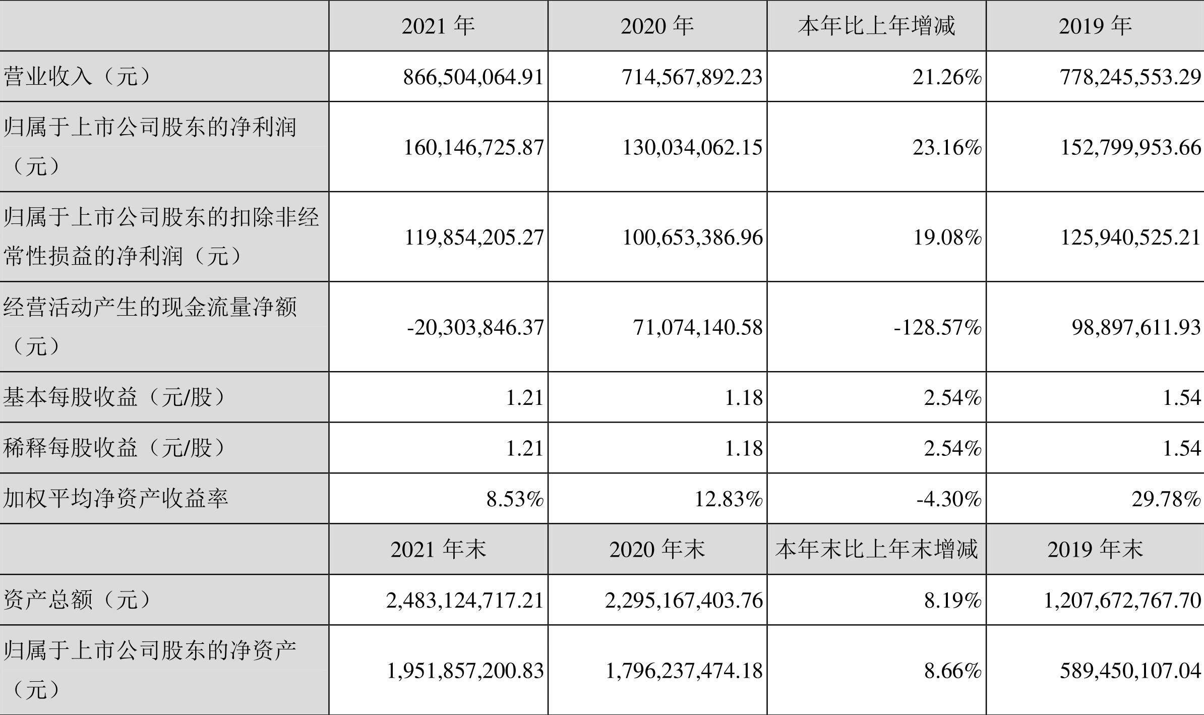 中证财讯 蓝盾光电(300862)3月22日披露2021年年度报告。2021年,公司实现营业收入8.67亿元,同比增长21.26%;归母净利润1.60亿元,同比增长23.16%;扣非净利润1.20亿元,同比增长19.08%;经营活动产生的现金流量净额为-2030.38万元,上年同期为7107.41万元;报告期内,蓝盾光电基本每股收益为1.21元,加权平均净资产收益率为8.53%。公司2021年度分配预案为:拟向全体股东每10股派4元(含税)。 报告期内,公司合计非经常性损益为4029.25万元,其中除同公司正常经营业务相关的有效套期保值业务外,持有交易性金融资产、交易性金融负债产生的公允价值变动损益,以及处置交易性金融资产交易性金融负债和可供出售金融资产取得的投资收益为3300.58万元,非流动资产处置损益(包括已计提资产减值准备的冲销部分)为-23.17万元。