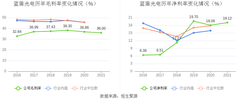 2021年,公司毛利率为36.00%,同比下降0.86个百分点;净利率为19.12%,较上年同期上升1.06个百分点。值得关注的是,近年来公司毛利率长期低于行业平均水平。