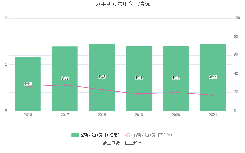 2021年全年,公司期间费用为1.44亿元,较上年增加329.24万元;但期间费用率为16.67%,较上年下降3.08个百分点。