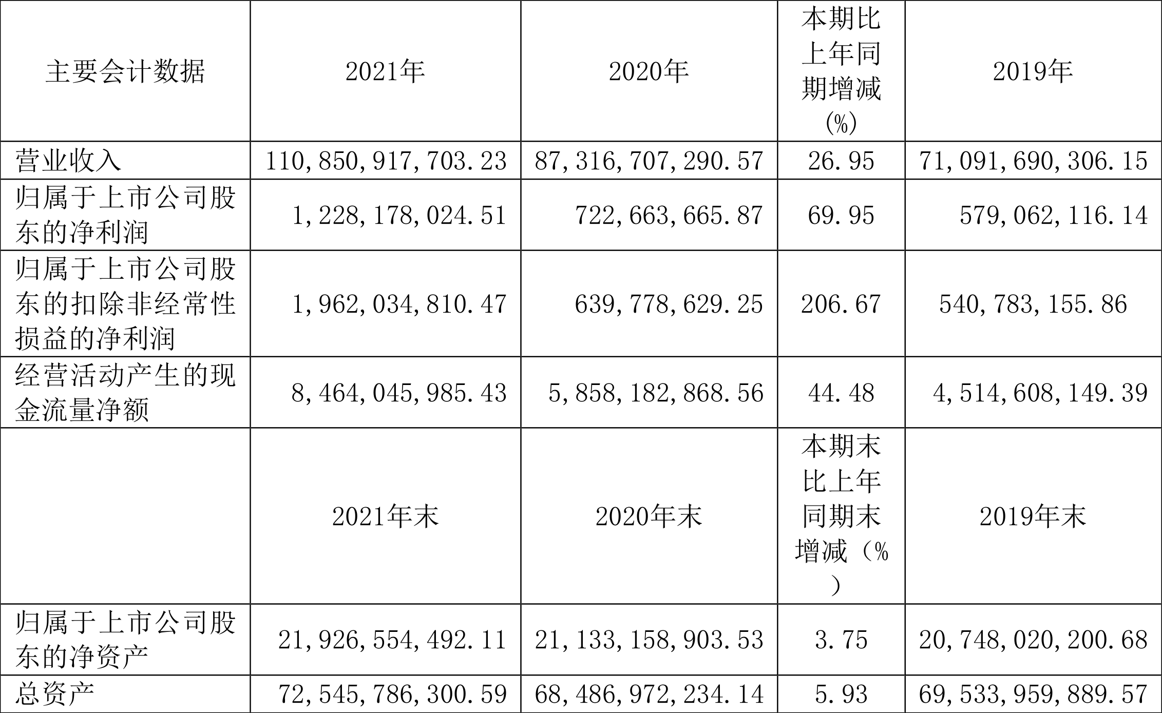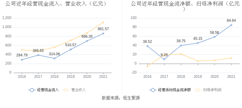 截至2021年末,公司经营活动现金流净额为84.64亿元,同比增长44.48%;筹资活动现金流净额-37.16亿元,同比减少8.68亿元;投资活动现金流净额-23.65亿元,相比上年同期减少3484.76万元。