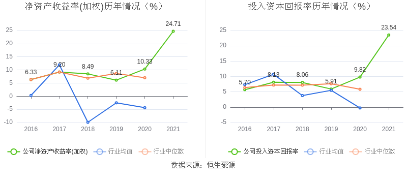 数据显示,2021年公司加权平均净资产收益率为24.71%,较上年同期增长14.38个百分点;公司2021年投入资本回报率为23.54%,较上年同期增长13.72个百分点。