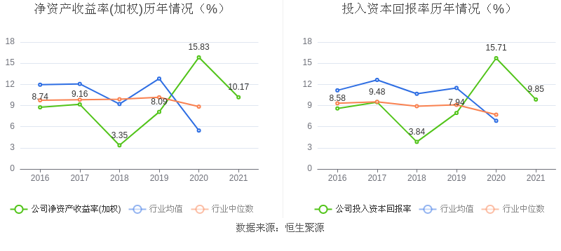 数据显示,2021年公司加权平均净资产收益率为10.17%,较上年同期下降5.66个百分点;公司2021年投入资本回报率为9.85%,较上年同期下降5.86个百分点。