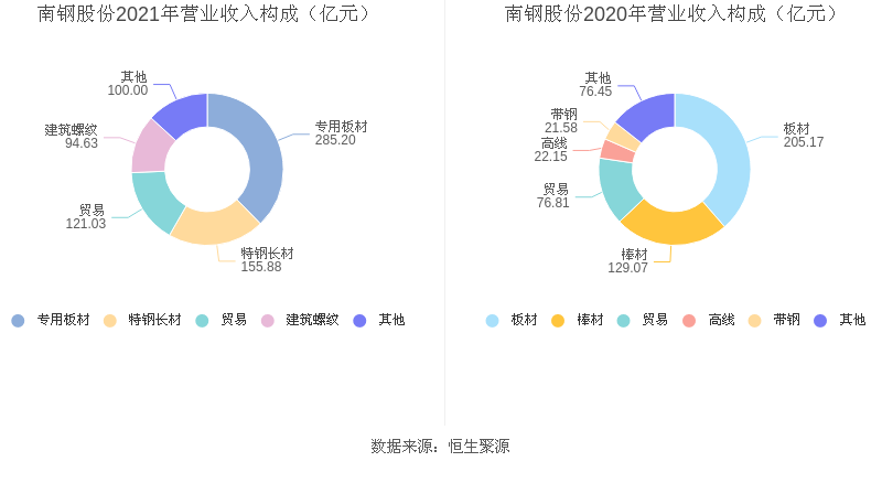 分产品来看,2021年度公司主营业务中,专用板材收入285.20亿元,占营业收入的37.69%,同比增长39.01%;特钢长材收入155.88亿元,占营业收入的20.60%,同比增长26.81%;贸易收入121.03亿元,占营业收入的15.99%,同比增长57.57%。