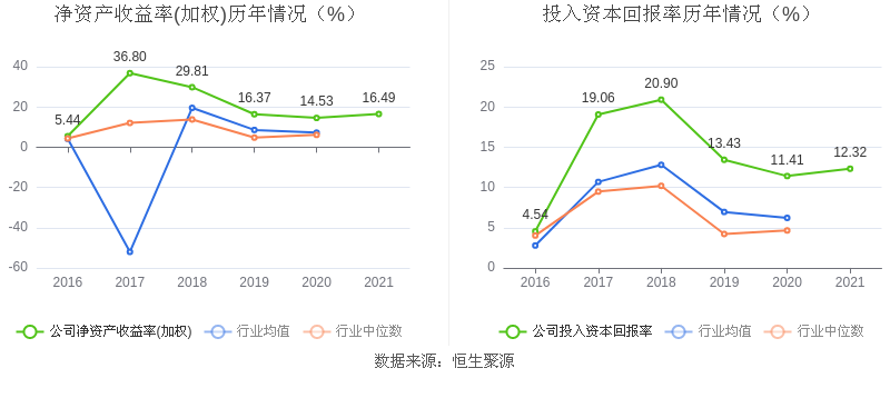 数据显示,2021年公司加权平均净资产收益率为16.49%,较上年同期增长1.96个百分点,长期高于行业平均;公司2021年投入资本回报率为12.32%,较上年同期增长0.91个百分点。