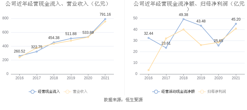 截至2021年末,公司经营活动现金流净额为45.20亿元,同比增长76.23%;筹资活动现金流净额4.39亿元,同比增长69.55%;投资活动现金流净额-53.91亿元,相比上年同期减少38.79亿元。