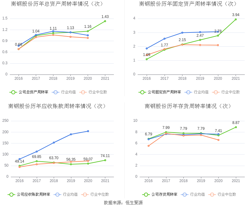 营运能力方面,2021年,公司总资产周转率为1.43次,上年同期为1.16次(2020年行业平均值为1.05次,公司位居同行业6/18);固定资产周转率为3.94次,上年同期为2.78次(2020年行业平均值为3.06次,公司位居同行业5/18);公司应收账款周转率、存货周转率分别74.11次、8.87次。