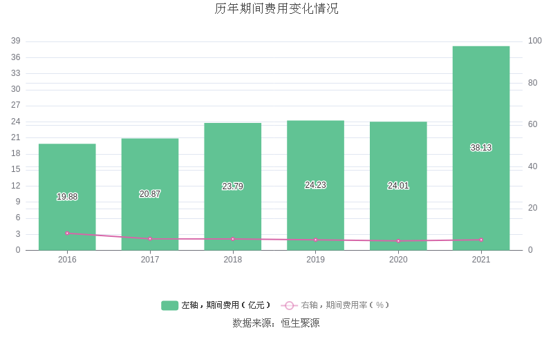 2021年全年,公司期间费用为38.13亿元,较上年增加14.13亿元;期间费用率为5.04%,较上年上升0.52个百分点。