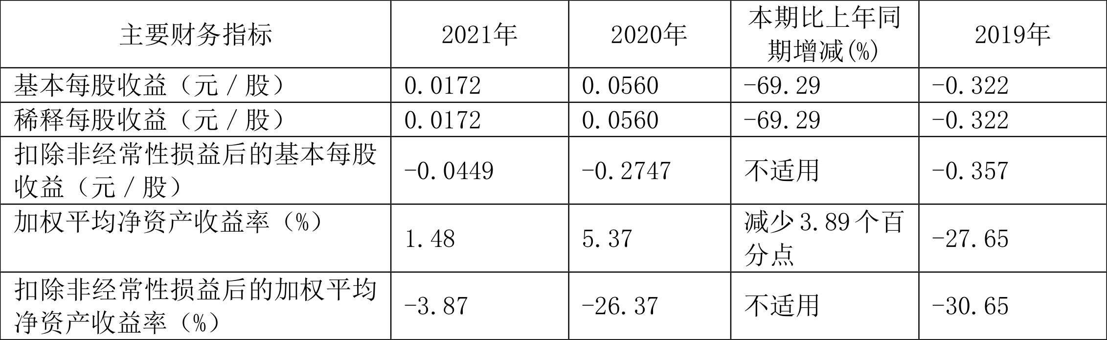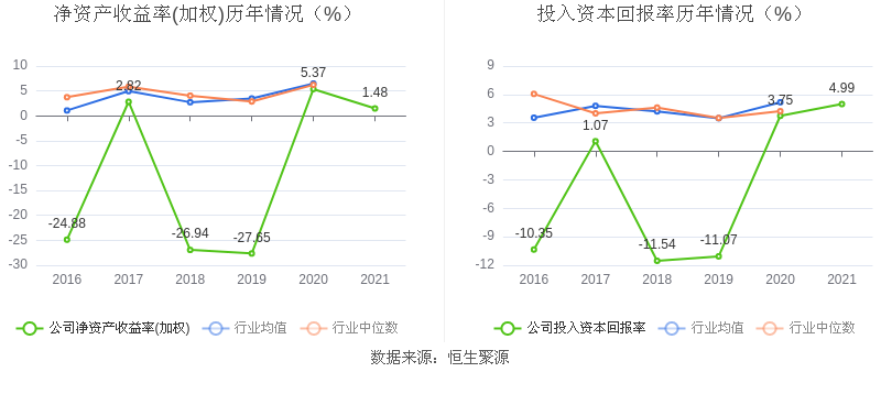 数据显示,2021年公司加权平均净资产收益率为1.48%,较上年同期下降3.89个百分点,长期低于行业平均;公司2021年投入资本回报率为4.99%,较上年同期增长1.24个百分点。