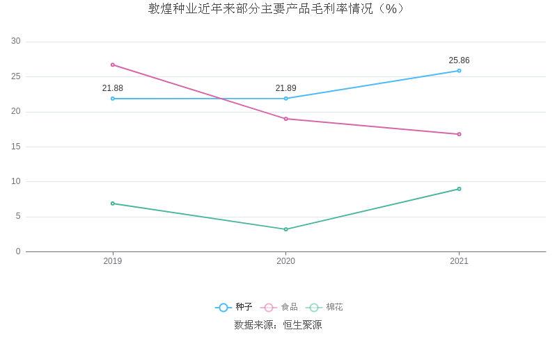 分产品看,种子、食品、棉花2021年毛利率分别为25.86%、16.79%、8.98%。
