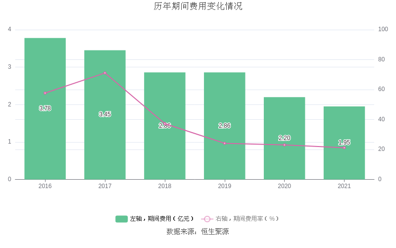 2021年全年,公司期间费用为1.95亿元,较上年减少2469.14万元;期间费用率为21.19%,较上年下降1.87个百分点。