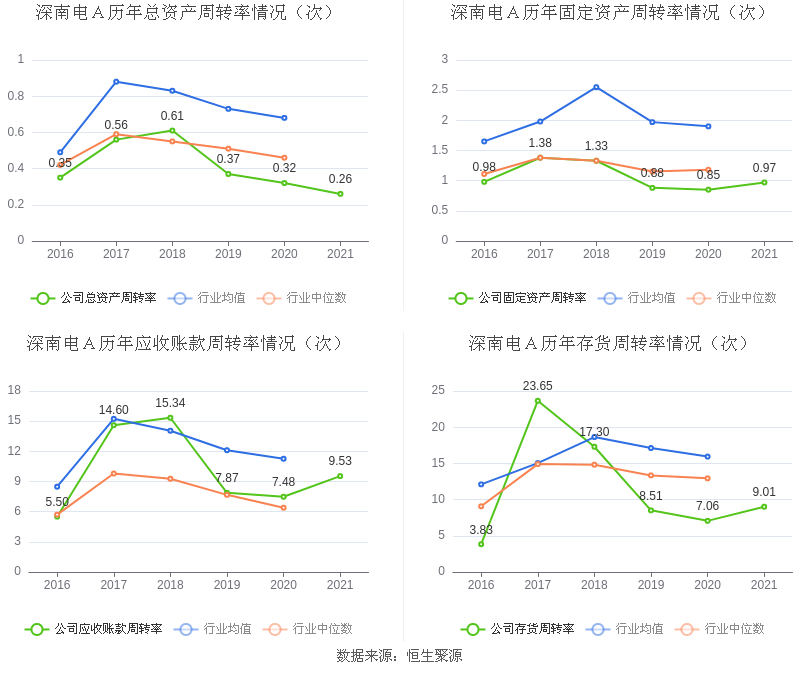 营运能力方面,2021年,公司总资产周转率为0.26次,上年同期为0.32次(2020年行业平均值为0.68次,公司位居同行业13/16);固定资产周转率为0.97次,上年同期为0.85次(2020年行业平均值为1.90次,公司位居同行业13/16);公司应收账款周转率、存货周转率分别9.53次、9.01次。
