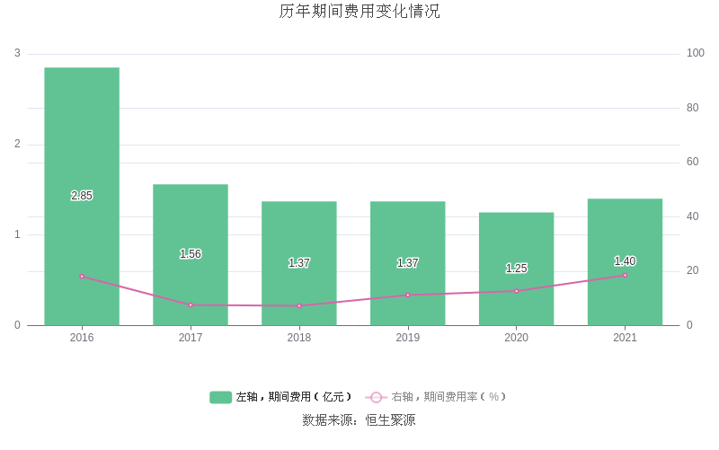 2021年全年,公司期间费用为1.40亿元,较上年增加1533.97万元;期间费用率为18.54%,较上年上升5.85个百分点。