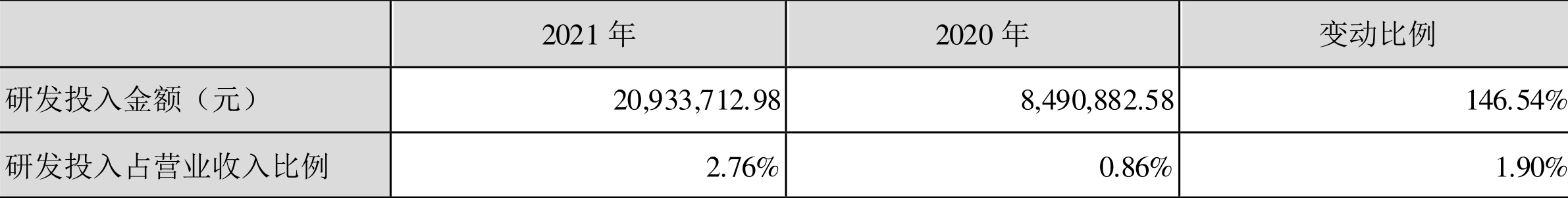 2021年全年,公司研发投入金额为2093.37万元,同比增长146.54%;研发投入占营业收入比例为2.76%,相比上年同期上升1.90个百分点。此外,公司全年研发投入资本化率为0。