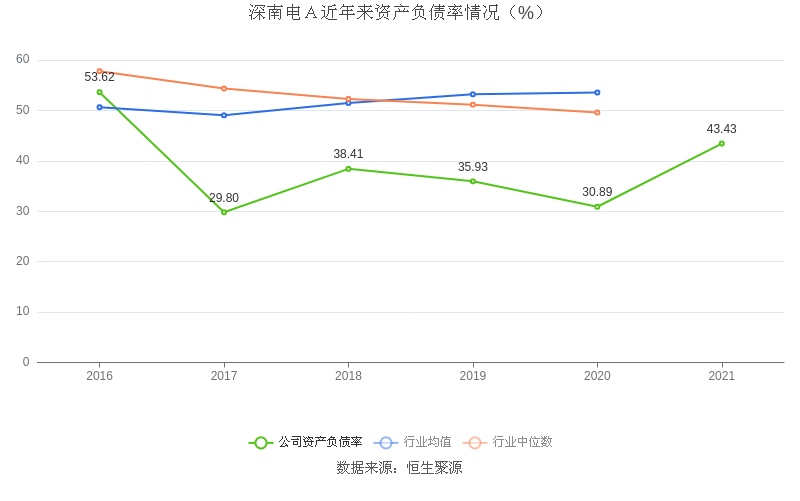 在偿债能力方面,公司2021年末资产负债率为43.43%,相比上年同期上升12.54个百分点,近年来整体低于行业均值。