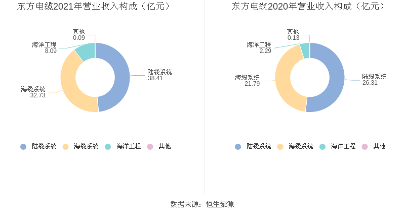 分产品来看,2021年度公司主营业务中,陆缆系统收入38.41亿元,占营业收入的48.43%,同比增长46.02%;海缆系统收入32.73亿元,占营业收入的41.26%,同比增长50.21%;海洋工程收入8.09亿元,占营业收入的10.20%,同比增长253.53%。