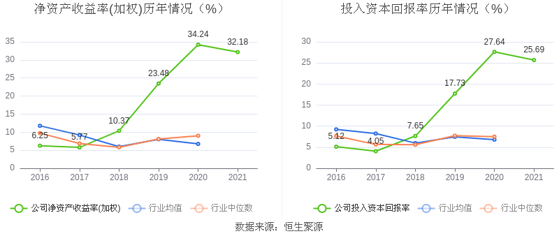 数据显示,2021年公司加权平均净资产收益率为32.18%,较上年同期下降2.06个百分点;公司2021年投入资本回报率为25.69%,较上年同期下降1.95个百分点。