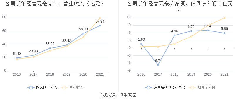 截至2021年末,公司经营活动现金流净额为5.86亿元,同比下跌15.54%;筹资活动现金流净额4.12亿元,同比增长67.80%;投资活动现金流净额-4.64亿元,相比上年同期增加3.66亿元。