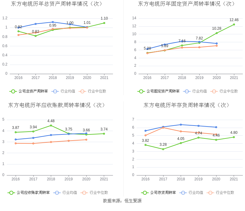 营运能力方面,2021年,公司总资产周转率为1.10次,上年同期为1.01次(2020年行业平均值为1.01次,公司位居同行业14/32);固定资产周转率为12.46次,上年同期为10.28次(2020年行业平均值为7.66次,公司位居同行业8/32);公司应收账款周转率、存货周转率分别3.74次、4.80次。